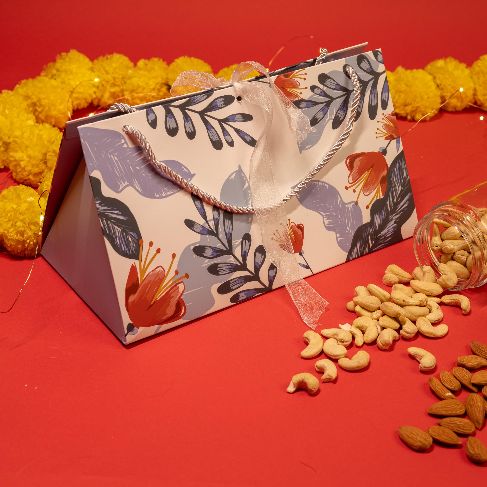 Each jar in the Mini Treat Hamper is packed with freshness and nutrition. Cashews and almonds provide protein and energy, while makhana adds a light and crunchy treat. The unique foldable triangle box enhances presentation, making it ideal for premium gifting occasions. Surprise your family, friends, or colleagues with this thoughtful hamper that’s as healthy as it is delicious.