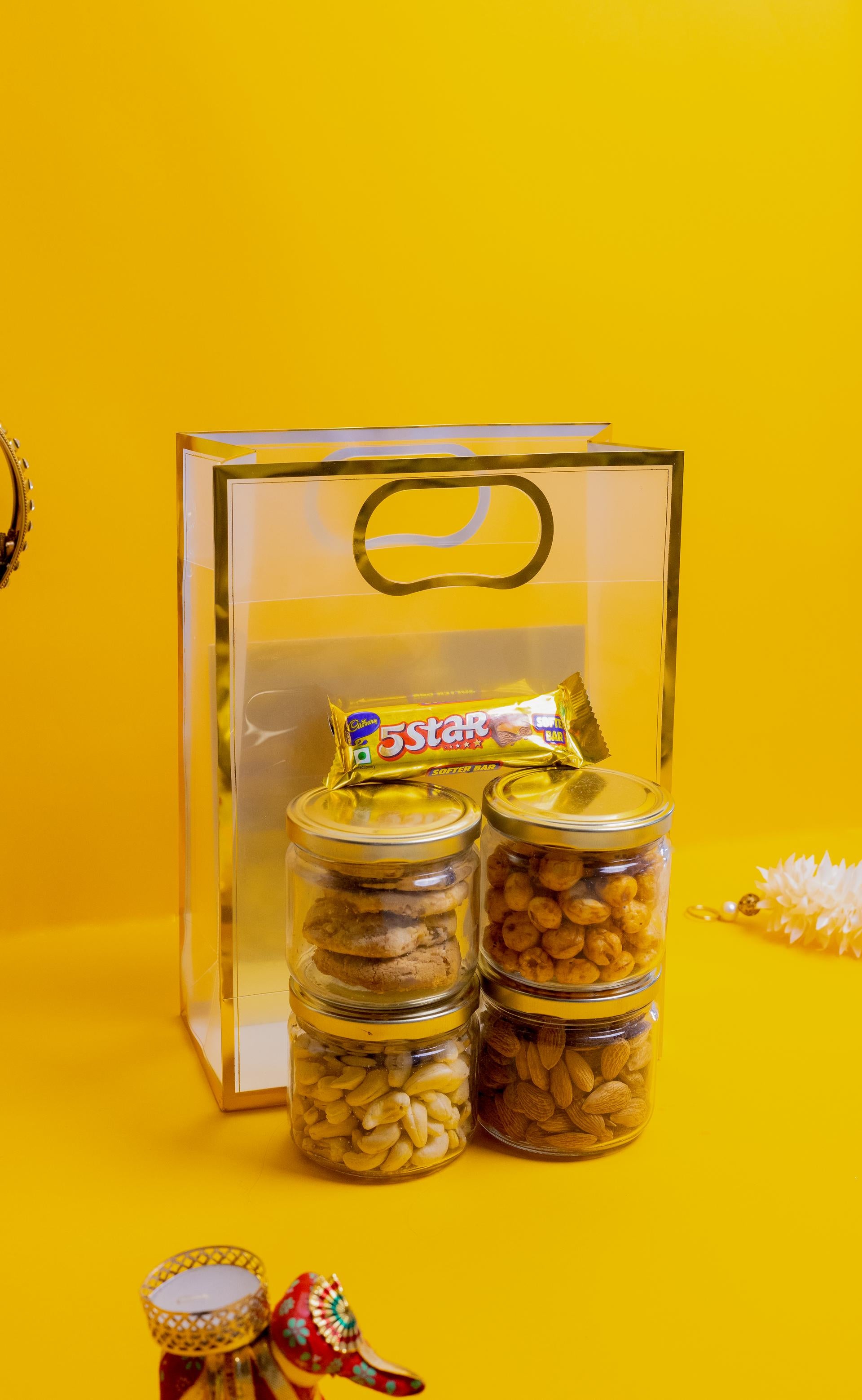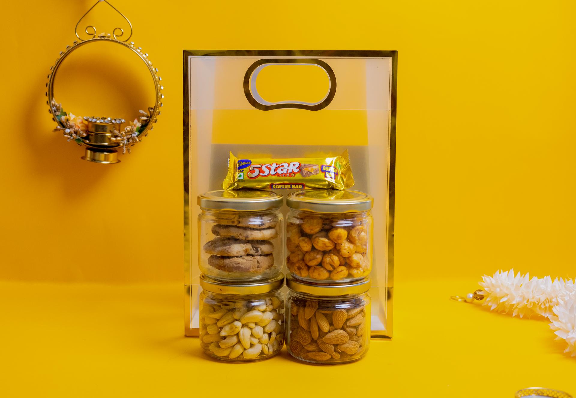 Celebrate the festival of love and siblinghood with the luxe rakhi hamper, a premium box designed to make your brother feel truly special. This indulgent Rakhi hamper features a 200 gms jar of almonds, a 200 gms jar of cashews, and a 200 gms jar of makhana – wholesome dry fruits packed with health benefits. It also includes a cookies jar (200 gms) baked to buttery perfection and a classic 5 Star chocolate to add a nostalgic sweetness. Completing the set are sacred rituals with roli chawal and nariyal, beautifully packed, along with a thoughtful card for your personal message. Elegant, traditional, and luxuriously crafted – this hamper is the ultimate blend of taste and tradition.