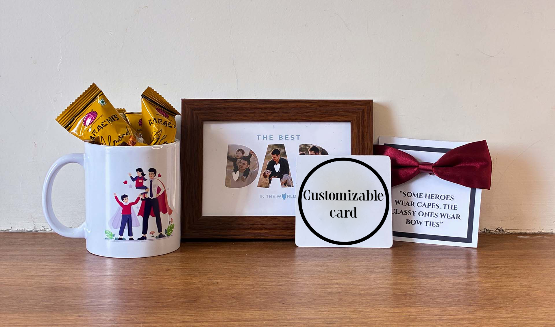 The minimalist dad hamper includes a sleek Coffee Mug for everyday sipping, a Bow Tie Set or Tie for polished appearances, a Wooden Photo Frame crafted from natural materials, Almond Chocolate for a hint of sweetness, and a Card with a heartfelt message. Additionally, each hamper features standout extras such as tumblers, bottles, and small accessories, ensuring a complete and delightful gifting experience.